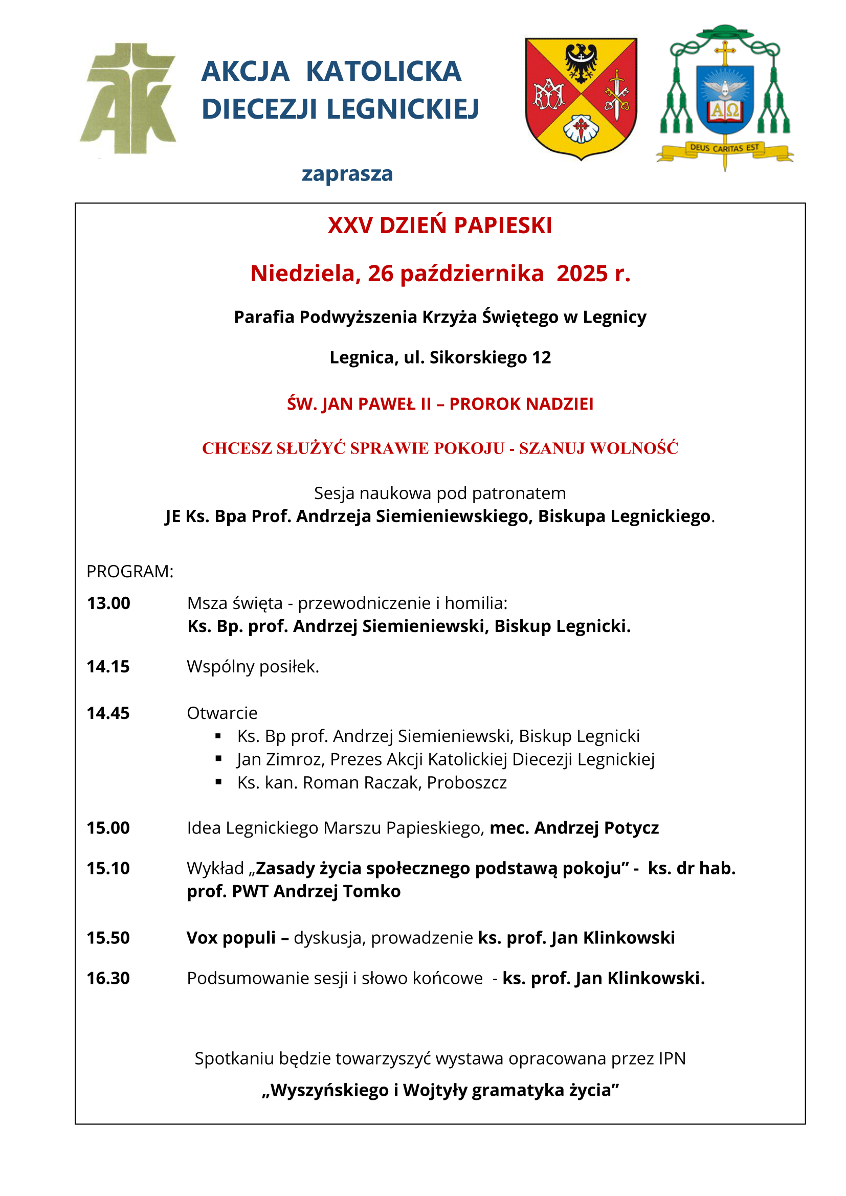 Parafia Podwyższenia Krzyża Świętego w Legnicy Sikorskiego 12, LegnicaNiedziela, 26 października 2025 r.Parafia Podwyższenia Krzyża Świętego w Legnicy Legnica, ul. Sikorskiego 12ŚW. JAN PAWEŁ II – PROROK NADZIEI CHCESZ SŁUŻYĆ SPRAWIE POKOJU - SZANUJ WOLNOŚĆ Sesja naukowa pod patronatem JE Ks. Bpa Prof. Andrzeja Siemieniewskiego, Biskupa Legnickiego. PROGRAM:13.00 Msza święta - przewodniczenie i homilia: Ks. Bp. prof. Andrzej Siemieniewski, Biskup Legnicki. 14.15 Wspólny...
